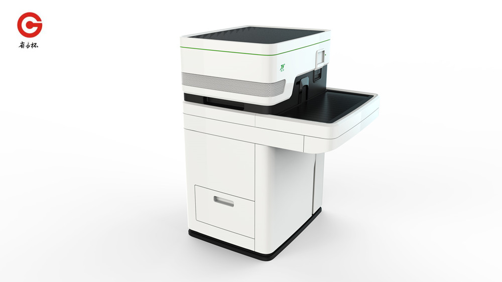 设计团队主要考虑,既要保证整机的造型与上部主机拆分后单独使用时的美观性,又要兼顾内部运动传输与外部物料交换等人机交互;以及对于正面的两个运动的门及传输机构,如何有效解决。